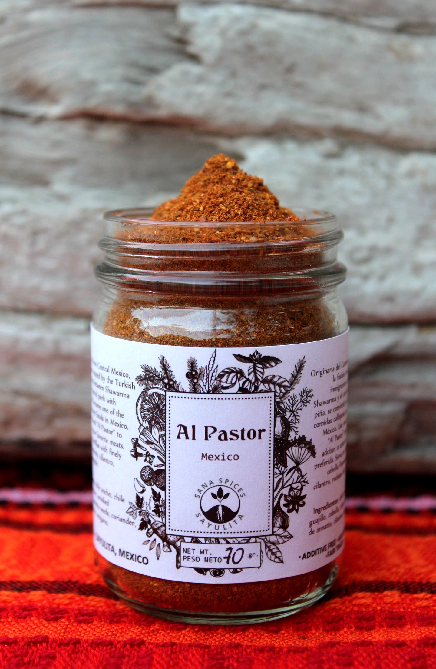 Ingredients: guajillo chile, ancho chile, annatto seed, chipotle chile, onion, garlic, coriander seed and leaf, oregano.
